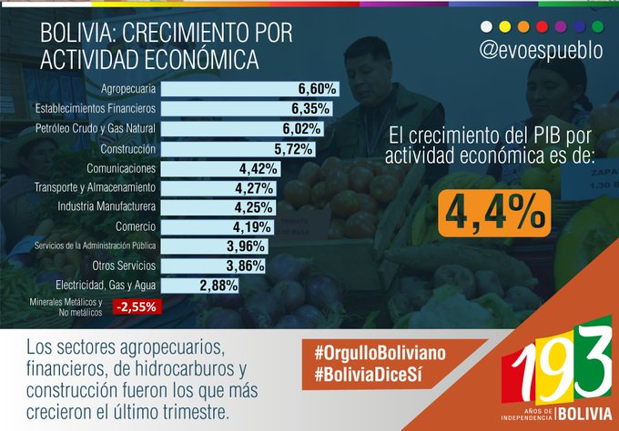 A tal proposito, il presidente ha dichiarato: «Nonostante il contesto esterno sfavorevole e le opinioni malevole di alcuni analisti, la Bolivia ha mantenuto la sua crescita, essendo elevata negli ultimi anni». Inoltre, il PIL della Bolivia tra il 2009 e il 2017 è cresciuto in media del 4,82%, mentre la media regionale si attesta intorno all’1,87%. «Dati che impressionano» tutti gli osservatori evidenzia Morales.